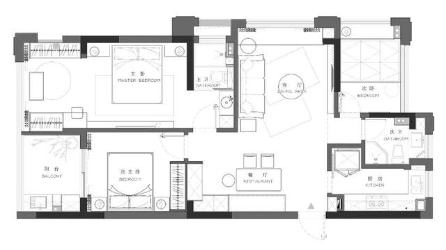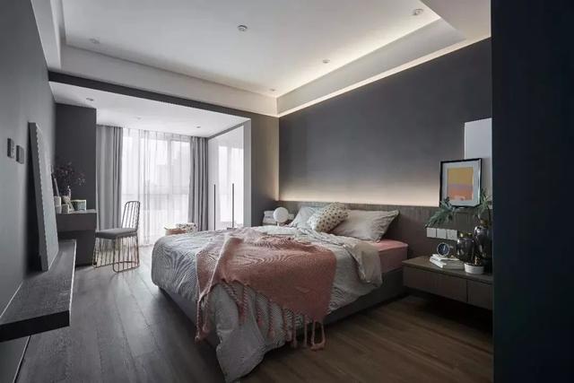 主卧室的床头靠背加上了背光的设计,顶部的主灯被舍弃,用嵌入式的筒灯代替,让人感觉更为简洁。卧室外的阳台包进卧室内,这样看起来也宽敞了不少。
