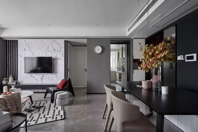 这是一套建筑面积126平米的后现代风三居室案例,设计师以灰色调为主,加入了大理石和金属元素,还增加了一抹粉色作为点缀,让这个家给人一种时尚大气而又优雅浪漫的感觉,营造出了惬意、轻奢的居住氛围。