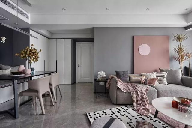 位于餐厅侧方的是客厅空间,客厅同样是选择了以灰色调为主,在背景墙和软装上加入一抹浪漫的粉色,让整个客厅变得更为优雅。