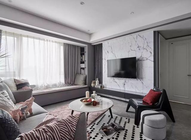 而客厅的电视背景墙处是做了大理石的造型,底部的电视柜悬空显得更为简洁。客厅侧方的飘窗两侧做上了柜子,在这里休闲也非常惬意。