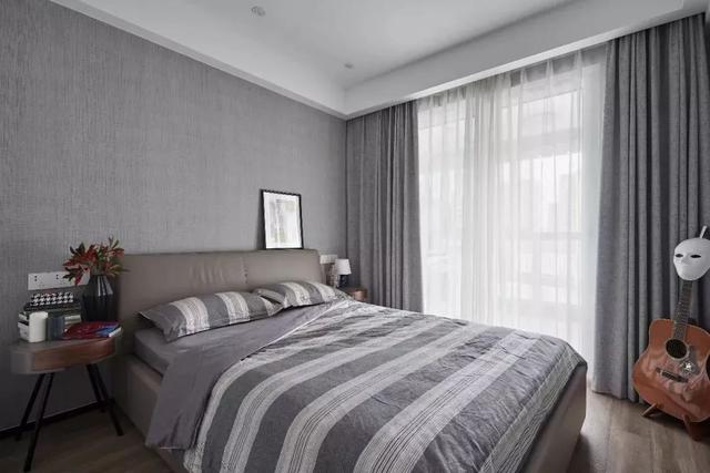 次卧的设计非常简单,灰色调的背景墙和灰色调的软装结合,不同层次的灰色让卧室不会那么单调,简约年轻的感觉也很适合孩子居住。