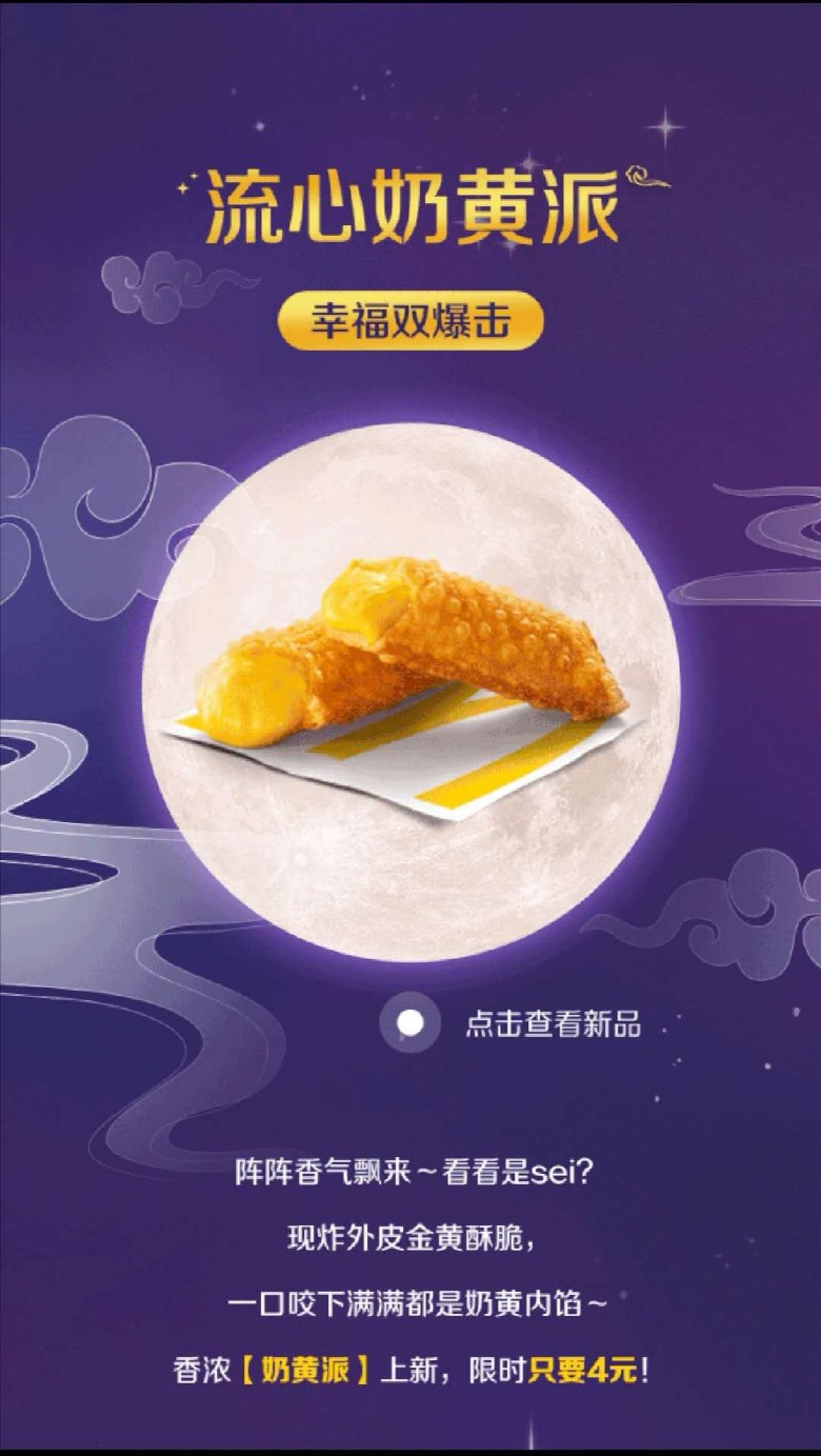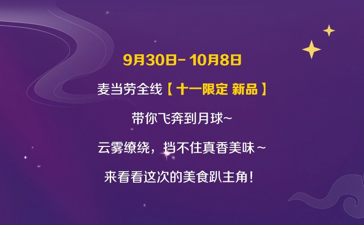 食品及包装以实物为准,图片仅供参考。嗨翻月球系列产品自2020年9月30日至2020年10月8日,在中国(本活动场景下不包括港澳台地区)部分麦当劳®餐厅售卖。机场、火车站等交通枢纽餐厅、旅游景区餐厅等特殊餐厅除外,具体以餐厅公示为准。