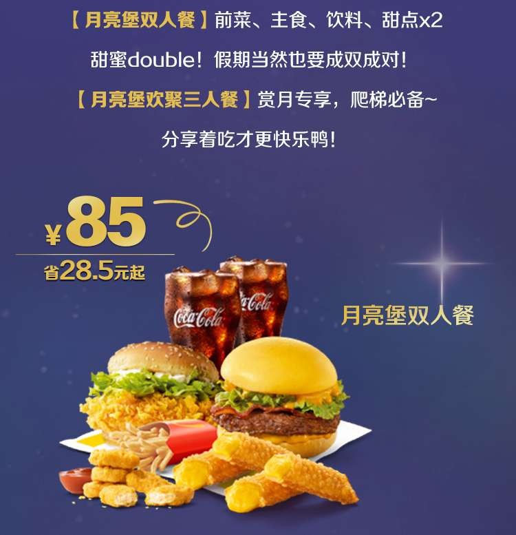 月亮堡套餐为指定组合,含月亮堡1个,中杯可口可乐1杯、中薯条1份。如遇产品售罄,餐厅将视餐厅供应情况为您替换价格相当的产品,以餐厅实际供应情况为准。
