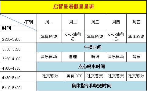 启智星2021年暑假星星班招生简章课程对象还没有入园或已经入园不能很好融合幼儿园的小朋友(2-6周岁),不能独立的孩子需要陪同。课程目标1. 建立常规,树立集体规则,通过社交游戏、音乐课、集体感统等课程,增加小朋友之间互相社交的机会,提高同伴社交效率,以及在同伴社交中提高语言和沟通能力。2. 提高共同关注的能力(提升孩子对环境和周围人的关注能力,学会用语言或非语言的肢体信号回应他人,通过模仿他人学习新的知识技能)3. 提高孩子玩游戏的专注力,增加游戏技巧,学会与他人共同游戏,能够在游戏回合中轮流等待,理解指令和基础的游戏规则,在游戏中提升认知和语言能力。4. 练习在集体中生活自理的能力,为上幼儿园或者更好适应幼儿园做准备。 课程表