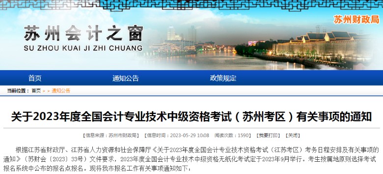 根据“苏州会计之窗”2023年5月29日消息,2023年度全国会计专业技术中级资格考试(苏州考区)报名缴费将于6月25日开始,7月10日截止,考试时间是 9月9日--11日。准备参加今年会计中级职称考试的考生要提前准备了。
