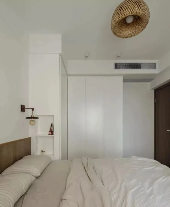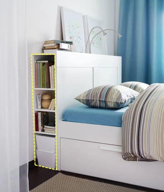 将卧室床往前移动20cm,里面塞个薄柜,看着窄,但其实内部空间还挺大,除了内部可以放些物品,侧面和上面也全都是收纳的好地方。