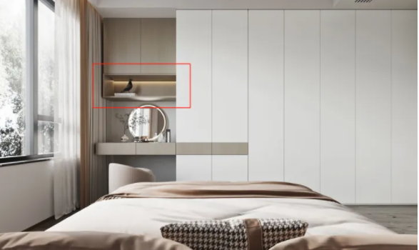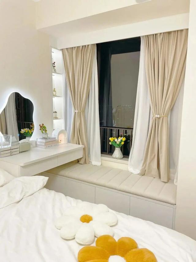 充分利用衣柜延伸,占用飘窗空间,实现一个化妆台功能,而且还避免衣柜遮挡窗户的采光,实用性有了,颜值也有了!