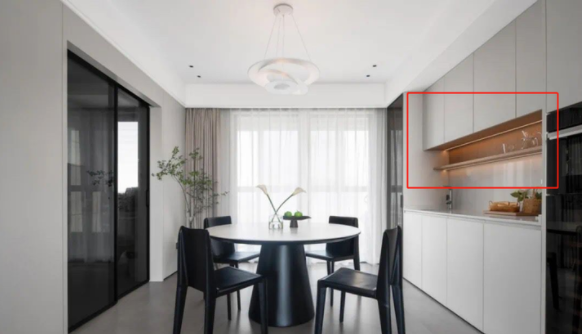 在吊柜的下方,延伸出来一个开放格,不仅可以让视觉上更生动协调,同时可以满足延伸一个随手置物的功能。