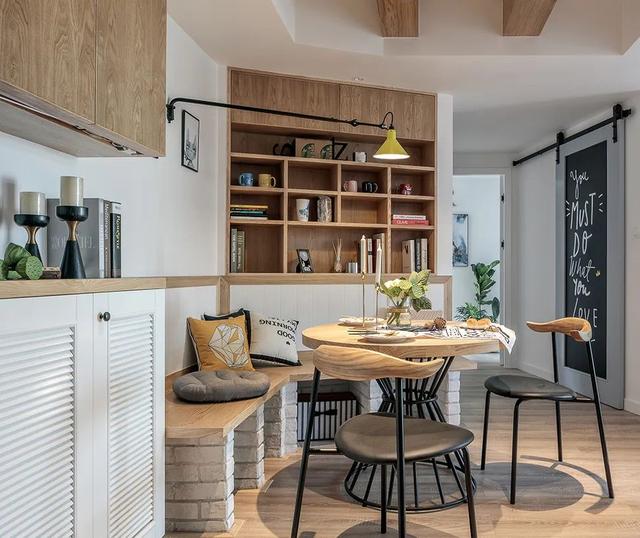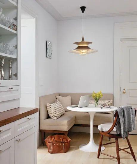空间小的餐厅,利用转角定制卡座可以满足就餐功能,而且还延伸了收纳。