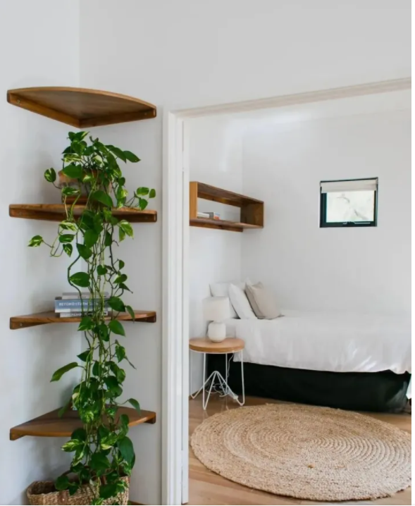 如图沙发旁边内向转角,利用隔板可以满足饰品的摆放,利用内转角做弧形隔板,满足装饰品和随手置物的需求。