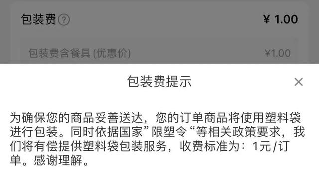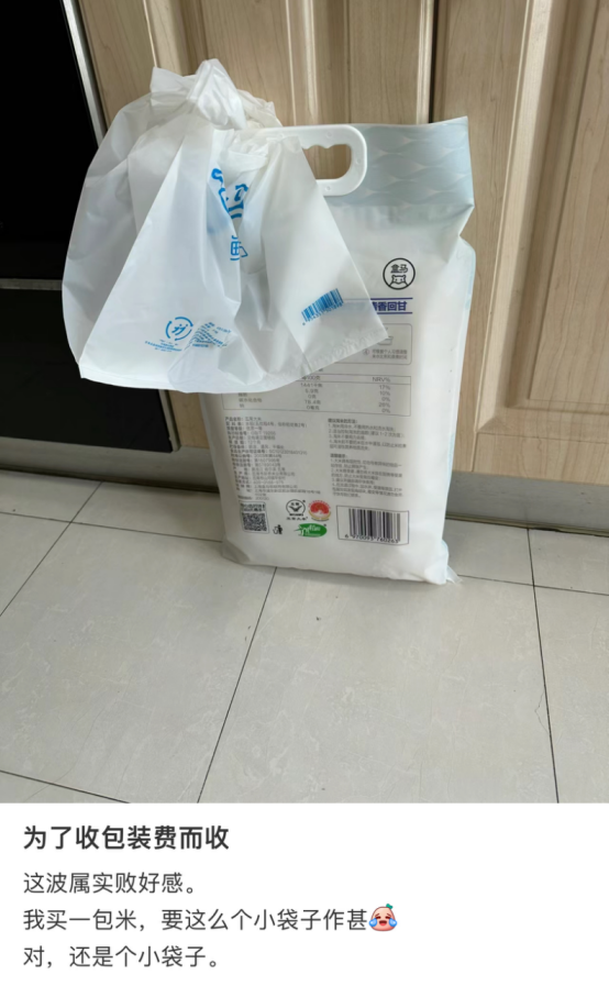 响应国家“限塑令”的规定本无大碍,但不少网友发现,这个规定下不管自己购买的东西需不需要包装,都要花这1块钱。一位网友晒单称——自己购买了一大袋大米,居然给了一个小塑料袋。另一位网友表示,自己购买了两桶桶装水,没有给包装袋,线上也收取了1元包装费。