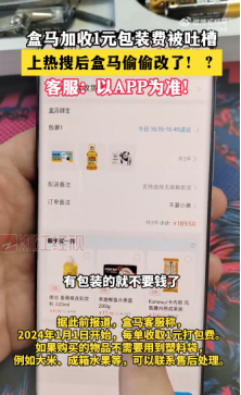 记者查询盒马App发现,盒马客服相关页面发布《1月1日起订单收取包装费通知》。据悉,自1月1日起,为确保商品妥善送达,用户的订单商品将使用塑料袋进行包装,同时依据国家“限塑令”等相关政策要求,盒马将有偿提供塑料袋包装服务,收费标准为每订单1元。