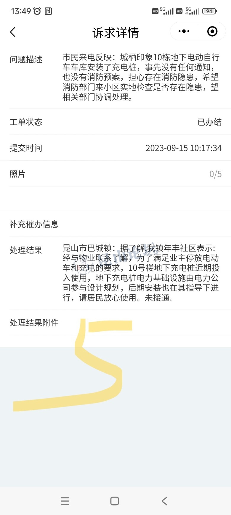 问题的处理结果反馈(微信平台上)显示是未接通,但是我是没有接到相关部门的电话(可能是打一下没有接到,就没有人再打给我了),具体的反馈是(图5):处理结果昆山市巴城镇:据了解,我镇年丰社区表示:经与物业联系了解,为了满足业主停放电动车和充电的要求,10号楼地下充电桩近期投入使用,地下充电桩电力基础设施由电力公司参与设计规划,后期安装也在其指导下进行,请居民放心使用。未接通。