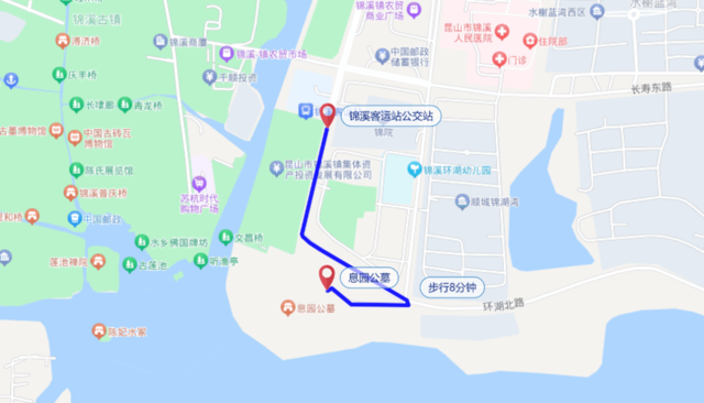 乘坐至锦溪客运站站下车,步行约8分钟抵达息园公墓