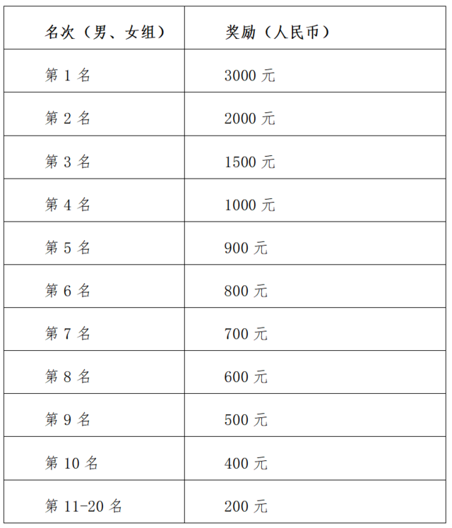 ① 按枪声成绩分别录取男、女前三名上台领奖,按净成绩分别录取男、女4-20名给予奖励,具体奖励标准见下表: