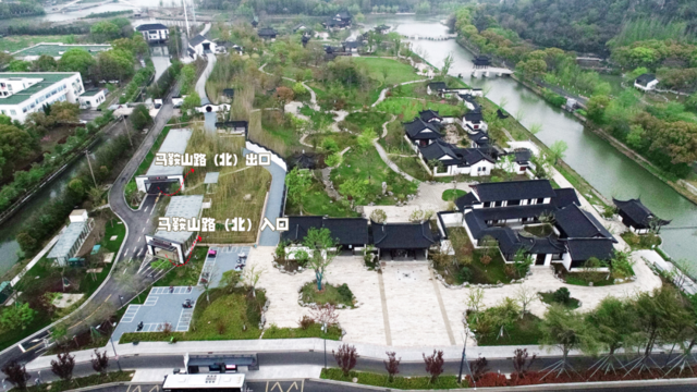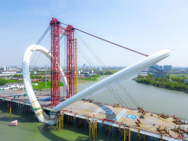 震川桥项目为江苏省重大交通水运项目,起点位于黑龙江路平交口,路线上跨青阳港,全长931米,其中,桥梁全长507米。其主桥为跨航道非对称钢拱塔斜拉桥,以“昆山三宝”之一并蒂莲为设计灵感,塔柱采用蝶翼形钢拱塔,分别向岸侧倾斜25度,大小拱塔分别高101.676米和78.676米,拱塔与桥面由30根斜拉索连接,两塔之间由12根斜拉索连接,两个张开的圆拱桥塔如两朵含苞待放的并蒂莲。