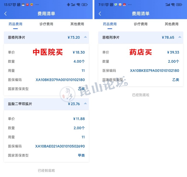 比较了一下同样的恩格列净片,中医院买单价18.3元,开开心心药房买单价39.33元,药房的单价是医院的翻倍还多,而且统筹支付的比例也小很多,基本都是个账支付。药店太贵,中医院排队时间太长,亭林社区没药,大家有啥好办法没?其他社区有没有这药?