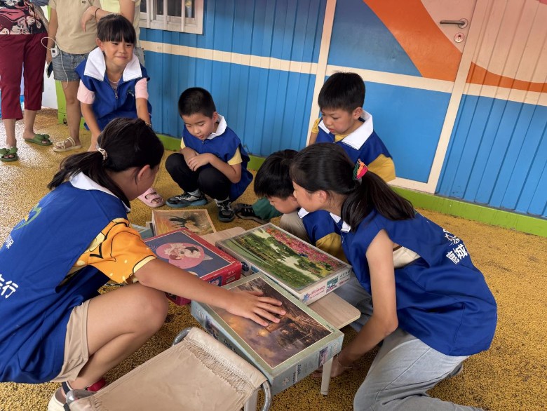 另一边,几位小朋友围坐在一起,用学校奖励的文具和练本交换拼图,其中一位小朋友开心地说:"已经拼完了好几副500片的拼图,正想要更难的呢。没想到今天就换到了这副1000片的,真是太棒了!回家就要和爸爸妈妈一起拼。"