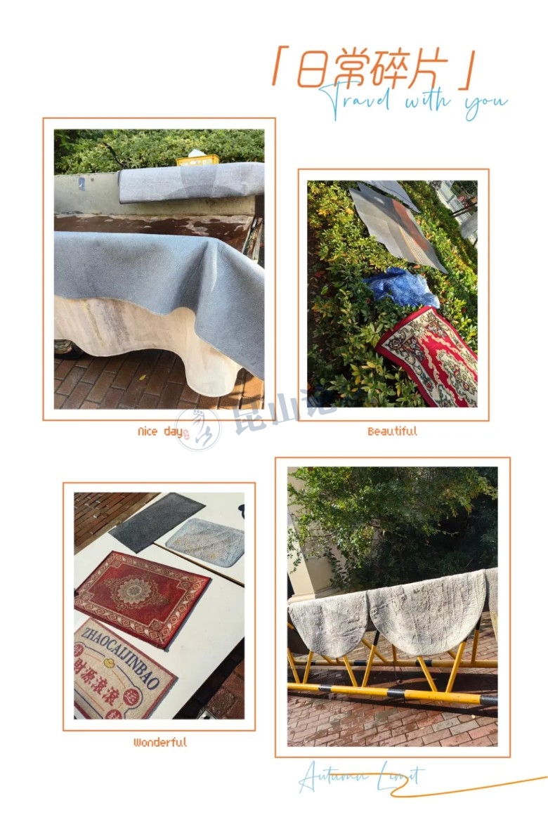 为业主服务到位,洗过的地垫又湿又重,工作人员洗净后叠好归位至业主的小推车上。