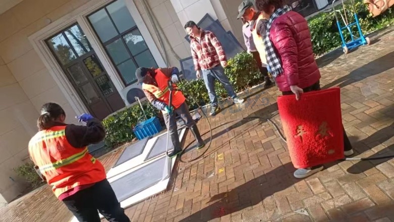 业主说:“哇塞,物业要给地垫做清洗啦!这可太棒啦!咱平时踩来踩去的地垫,不知道沾了多少脏东西呢,这下可好啦,要焕然一新咯!这就像是给我们家的地垫做了一次美容,能不开心?”