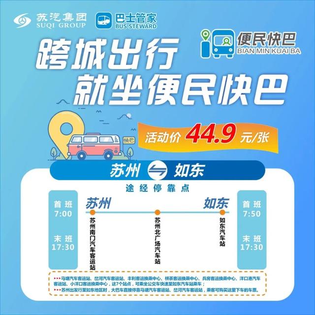 “便民快巴”活动价相当于班线票价的三分之二,具体为:苏州—南通39.9元,苏州—如东44.9元,苏州—通州42.9元,苏州—丰利44.9元,昆山—南通39.9元。