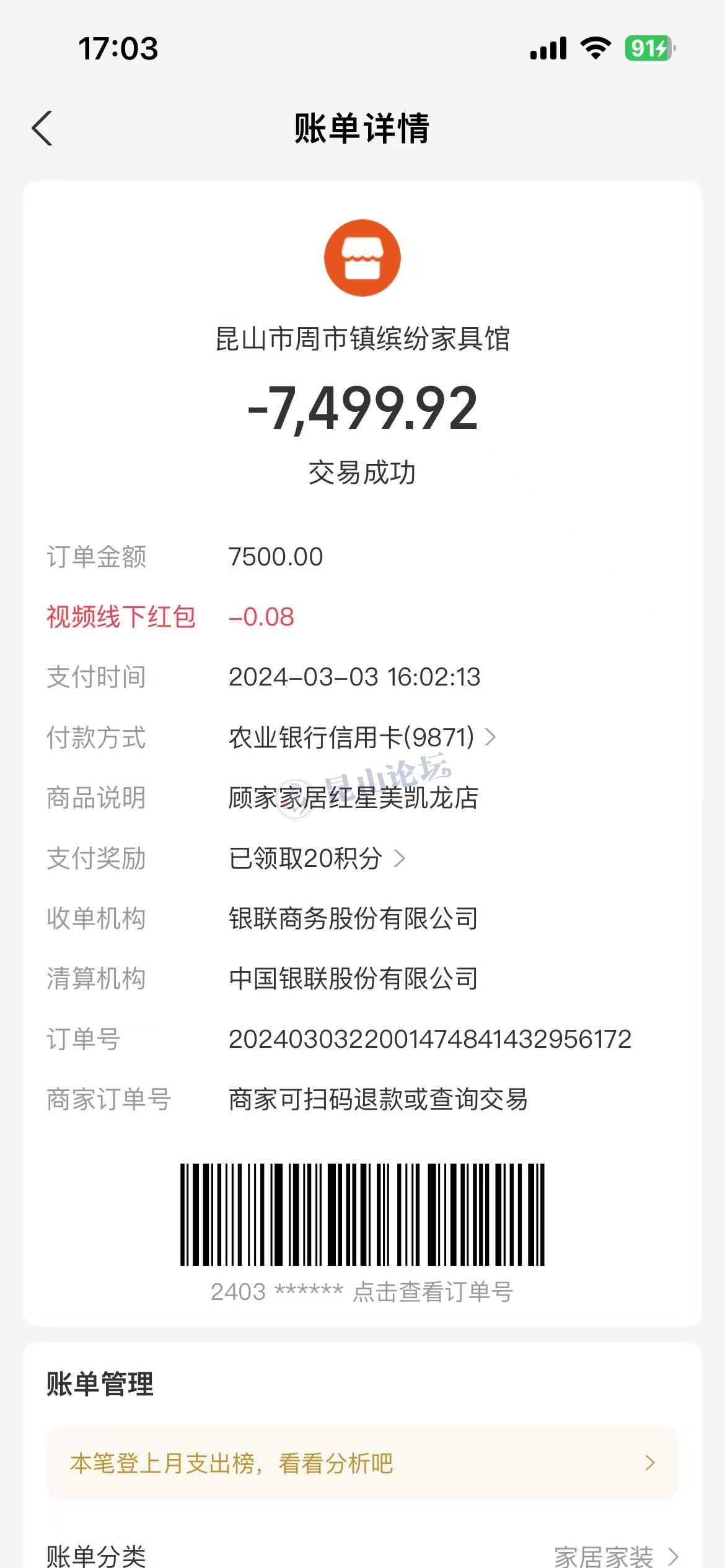 我于2024年315活动期间在昆山翠微东路518红星美凯龙顾家家居购买家居若干件,包括沙发、床、茶几及摇椅,总价折后12500元,先支付60%定金7500元,剩余款在我通知发货时支付。