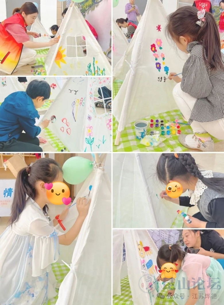 每一组家庭都热烈地讨论着如何作画,思维的碰撞、合作的精神得到了淋漓地展现。孩子们认真调色,涂涂画画,爸爸妈妈们从中帮忙指导,小小画笔在他们的手中挥动,绘制出一顶顶色彩鲜明,别具一格的帐篷。