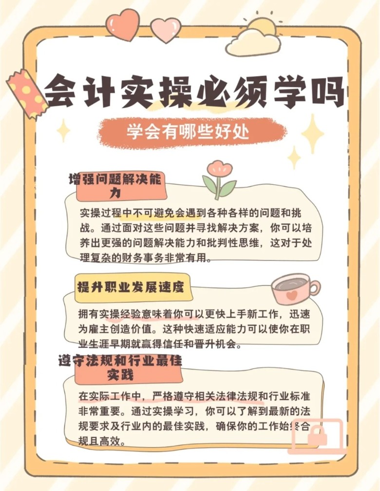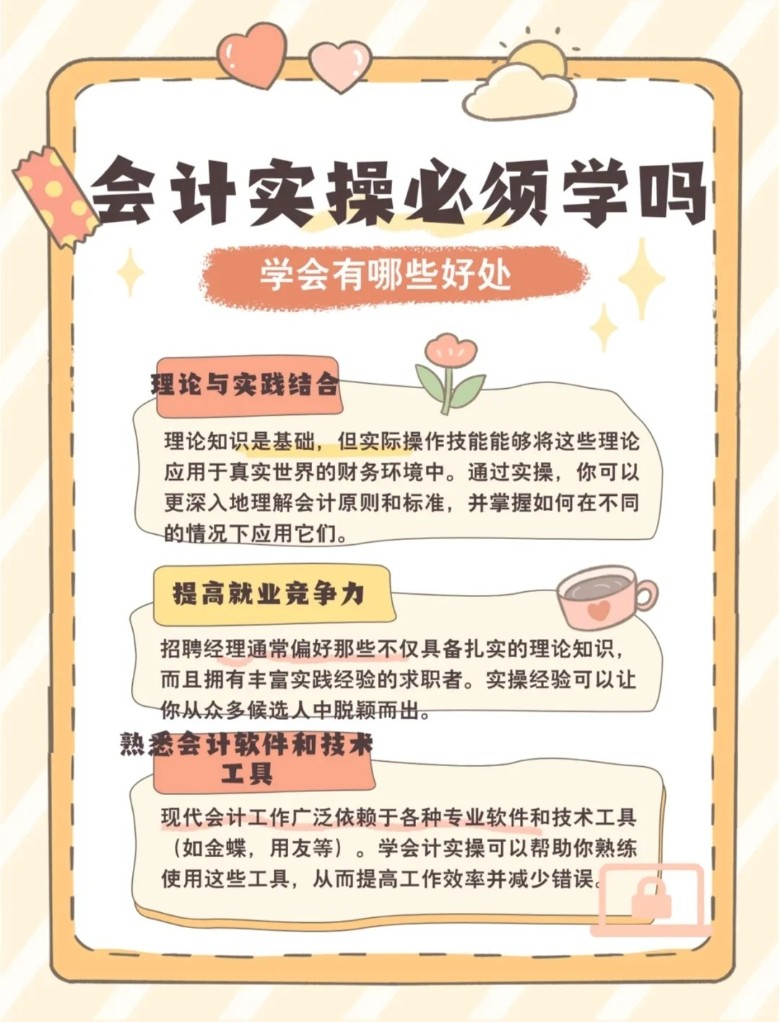 学会会计实操到底有多重要!!!为什么现在很多人有了中级甚至更高的职称证书,但是不会实操连上岗都没办法做到。就是因为大家忽略了实操学习,说白了,企业除了要考量你的证书,你的专业能力,最重要的的无非就是你的实际工作能力了! 🧐🧐🧐会计实操需要学习些什么? 🚀1️⃣做账——账务处理技能岗位要求1.会计法规、会计准则及相关政策;2.会计核算知识、原理及公司核算流程;3.凭证、单据、发票等处理技巧;4.财务软件及办公软件操作技巧;5.各类账簿管理;6.建账、入账、对账、结账流程。 2️⃣报税——开票报税技能岗位要求1.税收法规及相关政策;2.税务管理知识、原理;3.发票开具、领取、认证、抵扣;4.税控软件操作;5.增值税、所得税、印花税等各类税种申报流程;6.涉税账务处理。 3️⃣报表——报表编制及分析技能岗位的要求1.会计法规、会计准则及相关政策;2.会计核算知识、原理及公司核算流程;3.各类账簿及报表之间勾稽关系;4.财务软件及办公软件操作技巧;5.三大报表编制及解读分析技巧。 4️⃣Excel——财务Excel应用技能岗位要求1.会计法规、会计准则及相关政策;2.会计核算知识、原理及公司核算流程;3.财务软件及办公软件操作技巧;4.Excel基础操作、各类常用函数操作。 今天给大家总结的一些会计知识,希望大家用得上呀~🌈🌈🌈 联系方式:19941908283