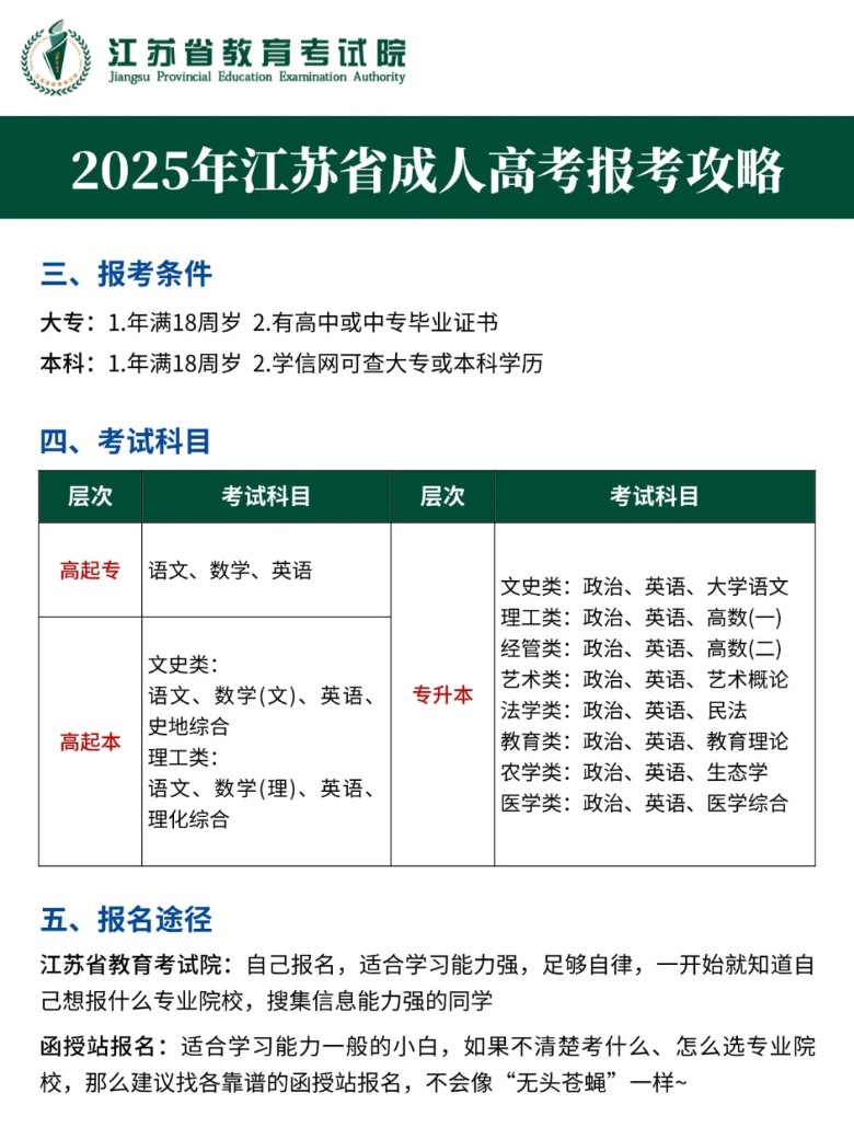2025年成人高考报名时间,成人高考考试科目【重要时间节点】✅预报名:1月-8月(领资料+备考)✅网报:8月底-9月初✅考试:10月18-19日🎯毕业时间:专科2.5年/本科3年/高起本5年💡【考试科目速查】🔸高起专:语、数、英🔸高起本:语数英+史地/理化🔸专升本:政治+英语+专业课(不同专业不同科目)管理和理工类专业课是考数学三门满分450分,可以参考江苏省历年录取分数线。一般在130-150分左右就可以被录取。🏫【学费一览】专科文科1700/年|理科1900/年本科文科2000/-2200/年|理科2200/-2420年双一流+医学类学费稍高昆山才思教育江老师19941905958玉山城北紫竹路九方街九栋三楼