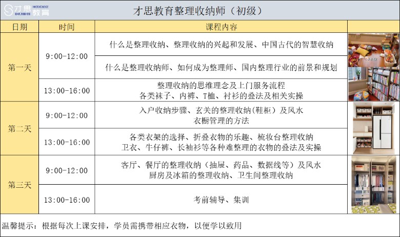 一、报名条件具备以下条件之一者,可申报五级/初级工:(1)年满16周岁,拟从事本职业或相关职业工作(2)年满16周岁,从事本职业或相关职业工作具备以下条件之一者,可申报四级/中级工:(1)累计从事本职业或相关职业工作满5年。(2)取得本职业或相关职业五级/初级工职业资格(职业技能等级)证书后,累计从事本职业或相关职业工作满3年。(3)取得本专业或相关专业的技工院校或中等及以上职业院校、专科及以上普通高等学校毕业证书(含在读应届毕业生)。具备以下条件之一者,可申报三级/高级工:(1)累计从事本职业或相关职业工作满10年。(2)取得本职业或相关职业四级/中级工职业资格(职业技能等级)证书后,累计从事本职业或相关职业工作满4年。(3)取得符合专业对应关系的初级职称(专业技术人员职业资格)后,累计从事本职业或相关职业工作满1年。(4)取得本专业或相关专业的技工院校高级工班及以上毕业证书(5)取得本职业或相关职业四级/中级工职业资格(职业技能等级)证书,并取得高等职业学校、专科及以上普通高等学校本专业或相关专业毕业证书(含在读应届毕业生)。考试时间每1-2个月安排考试(均在周末半天)一周左右出成绩,15天-20天左右出证入江苏省人社官网政策补贴:初级(五级)补贴800元中级高级(三级)补贴1800-2340元现在就和大家分享下考证流程,包括报名、备考以及补贴申请,希望能帮到感兴趣的宝子们~1️⃣学习课程:职业技能培训,每周安排1次课,周日上课9:00-12:00,13:00-16:00。2️⃣报考费用:学费670元 考试费130元3️⃣报考材料:提供学历证明、社保证明(近一年的)、证件照片、身份证照片4️⃣考试内容:理论知识+实操,线下考试5️⃣证书下载:考试合格,下载电子证书。江苏智慧人社APP——我的——我的证照——技能等级证书,即可查询下载6️⃣补贴申请:江苏智慧人社APP——首页搜索补贴——技能提升补贴申请——选择证书,进入补贴申请,直接提交(整个流程约15天,收到了800元的技能提升补贴)发展前景1专业整理收纳服务:家庭服务:为个人/家庭提供上门整理收纳服务,帮助客户优化居住环境企业/机构服务:为办公室、商铺、酒店等商业空间提供定制化整理方案,提升工作效率和品牌2教育培训与咨询职业培训师:在培训机构或学校教授整理收纳课程,培养行业新人企业内训:为企业员工提供收纳技能培训,优化办公环境管理个人咨询顾问:通过线上/线下方式提供收纳规划建议,解决客户的个性化需求3家政行业相关岗位家政公司专职收纳师:加入家政公司,覆盖家庭保洁,空间优化等综合需求高端家政服务:针对高收入家庭提供高端收纳服务,通常薪资更高且服务周期较长4自主创业与品牌经营开设工作室:成立个人/团队工作室,提供定制化服务,逐步建立口碑品牌自媒体运营:通过社交媒体分享收纳技巧,吸引流量后实现知识付费/广告变现等昆山才思教育江老师19941905958玉山城北紫竹路九方街九栋三楼