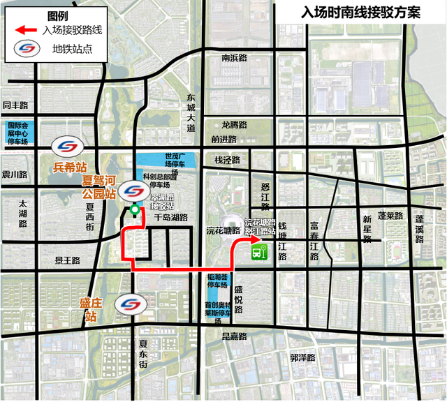 主要接驳国际会展中心停车场、世茂广场停车场、时代大厦停车场、金汇丰停车场、艺术宫停车场以及乘坐苏州地铁11号线在兵希站下车的球迷观众。