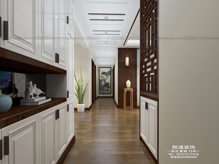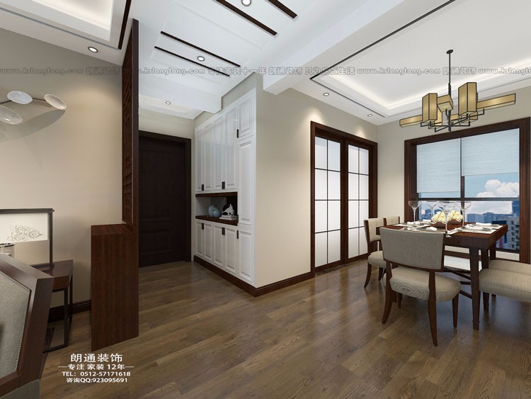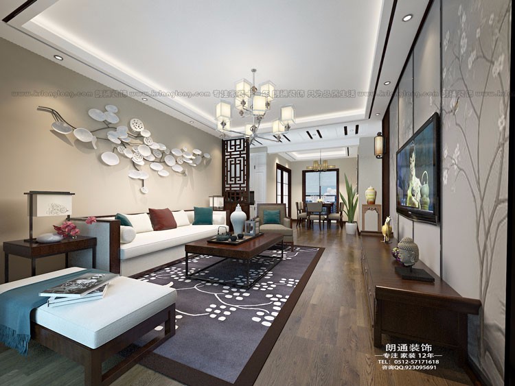 施工单位:朗通装饰 项目地址:新城天地设计单位:朗通设计团队 装修风格:新中式风格 主要材料:有色乳胶漆、艺术雕花隔断、艺术烤漆玻璃、壁纸、地砖、地板等等。 设计理念: 如何古为今用,推陈出新,将传统的“中国元素”完美地融入室内设计中是值得我们探索的,毕竟这是从我们文化之根上生长出来的,我们也最有可能在这方面获得创意优势。传统的中式设计,主要运用对称均衡的手法,四平八稳,中规中矩,色彩上多采用朴素稳重的颜色,材质上主要运用木材和石材。而今要有所突破,就要在布局中寻求变化,丰富其空间印象;在色彩上增加亮色,带来活泼生气,增添音乐的跳跃感;在材质上可以运用现代工艺,采用对比手法,如使用玻璃和不锈钢与岩石、实木等材质的对比,既能增强现代感又不失整体中式感。 效果图: