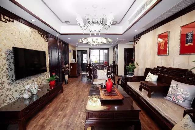 淡金色花纹的电视机背景墙及沙发背景墙融入了现代风格的元素,搭配低调奢华的红木家具,不仅体现了中式的气息也给传统的韵味中增添了一许时尚的味道。