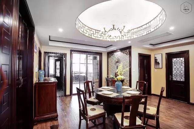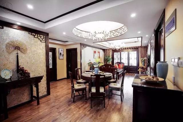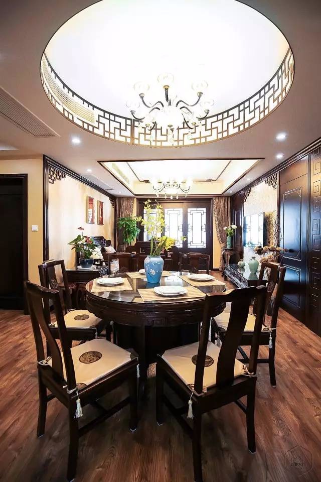 圆形吊顶设计在有其美观的同时也加强了整体空间感,吊顶边套设计时尚感十足,同时也营造出了温馨感 餐厅旁边的金色背景