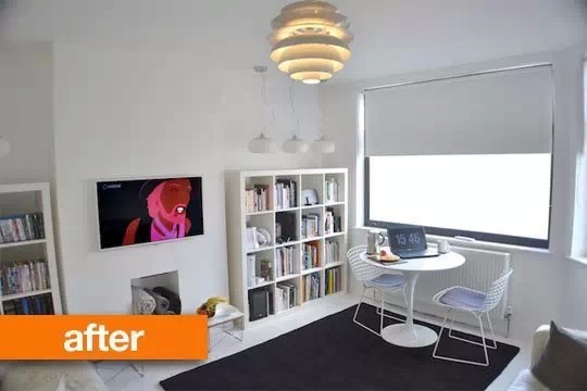 改造后▼改用了一组轻巧的圆桌组,以及很便宜的方格柜,一块地毯明确了分区。小家具增加了功能空间,还让空前的比例看起来更完美开阔。