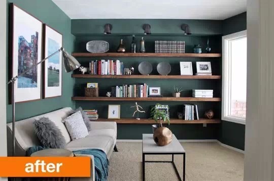 改造后▼该用了有灰度的绿色的墙面,气场非常强烈,空间变得冷静有质感,搭配原木色搁板组合,以及轻盈现代的家具,一个有格调的小空间立现。