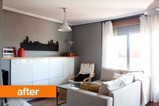 改造后▼是的,把之前那个将近2米高的大柜子,换成了目测高1.4米左右的矮柜,沙发换成了浅色。是不是开阔了?现在再看改造前,那个大柜子是不是很压抑?