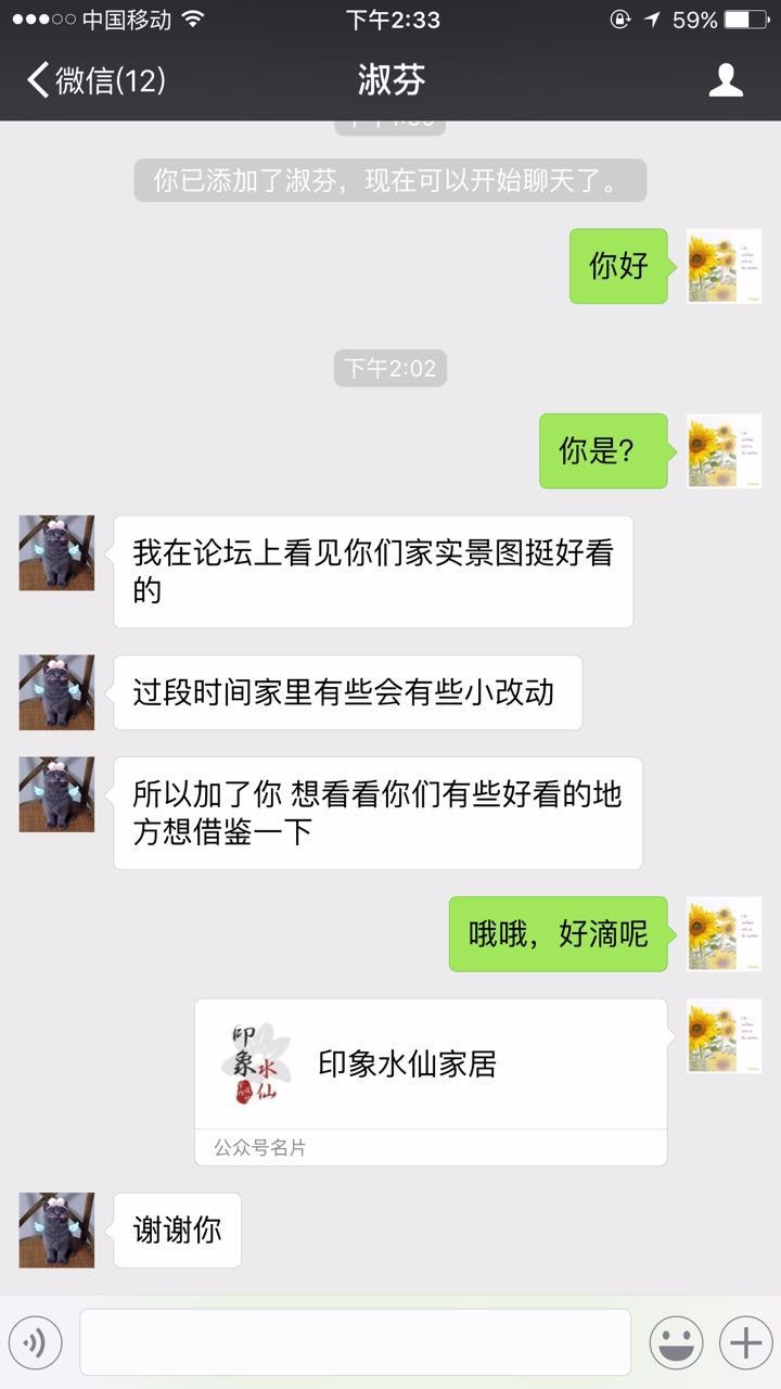印象水仙设计:今天忽然加到的客户,因家里需要小动,虽只是想借鉴一下我们的实景,但心意很重要![表情] (2017-08-20 22:25)