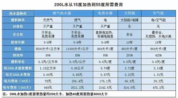 上图是某空气能热水器推广宣传的对比图,当然这图肯定夸大了空气能和其他热水器的差距,而且算的是每天200L从15度加热到55度,其他很多地区很多家庭肯定用不了这么多的热水量。但是使用成本大概哪个多哪个少还是可以参考的:电热水器>燃气热水器>太阳能≈空气能。 但是这里忽略了初装购机成本,如果算上空气能比燃气热水器贵出来的几千块购机成本,普通三口之家至少得用十来年才可能拉平成本,所以还是别说成本了,还是考虑用起来爽不爽吧。 我不去比各种热水器的性能了,我说一下我对各个热水器的综合感受吧,除了壁挂炉,其他几种热水器我都用过。 燃气热水器:是我个人最推荐的热水器,如果有条件装的话。一般装在厨房间,主流是强排式,更好一点是平衡式(安全性更高,但价格贵,安装费也更贵),还有冷凝式热效率更高,但一定要提前考虑好冷凝水排水管(不然非常麻烦,别问我怎么知道的)。还有北方一定要选防冻型。 结论:13L是主流,可以满足日常家庭,一边洗澡一边洗碗建议16L以上,两个卫生间同时洗建议更高,升数越高机器价格越贵。(又不是开澡堂,家里人难道还不能错开洗澡吗) 储水式电热水器:最常见的热水器之一,和燃气热水器一样各占45%以上的市场份额,其他类型的热水器加起来估计只占10%不到。我个人觉得储水式热水器共同的问题是水箱太大太碍事了,往卫生间一挂,一个字:丑。还有一个问题是容量,如果用大顶喷洗澡,女生洗久一点,其他人就得等几十分钟了。 结论:每人用热水量建议按30L算,三口之家建议80L以上吧。 空气能热水器:这几年也挺流行,因为推广的时候都说省电,其实算上这价格差,不用个10年估计是回不了本的。空气能说白了原理就类似空调,能从空气中吸收热量把水加热,气温低就不太好使,所以北方不建议。还有,大水箱得找个地方放。 结论:北方不合适,另外加热速度慢,所以南方也一定要买个大容量的,建议直接200L以上。 太阳能热水器:太阳能热水器安装限制实在太多了,一般的城市公寓基本不合适,多数落差式的水压也比较小,洗起来不够爽,另外一定建议出水配个恒温阀。 壁挂炉:一般就是用于装地暖的,同时解决了家庭用水的需求,可以直接理解成大号的燃气热水器。 即热式电热水器:几年前我用过7000W的即热式,冬天那个热水量也实在比较小,洗澡洗起来不够舒适,比燃气还是差远了。另外有一个安装问题,一定要提前布置大功率的电线,一般需要4-6平方,有的甚至电表都得换。 除了热水器,还有一个问题,每次用热水,都得放掉热水器和龙头之间的热水,比如燃气热水器装在厨房或者阳台,距离卫生间远,冬天每次得放掉一脸盆冷水。如果想解决这个问题,可以考虑家庭热水循环系统。有的高级的燃气热水器还自带热水循环功能。 这是个什么系统呢?其实就是一个1000元左右的小机器,也不一定要布置回水管,后期也可以加装。家用的话不需要像酒店一样24小时循环,浪费能源,有一种是自己可以设置常用时间段,比如早上起床和晚上睡觉等,还有一种是开一次龙头就启动,然后等大概1分钟后再开龙头就是热水了。 怎么样,了解了了吗?你家的热水器给力吗?