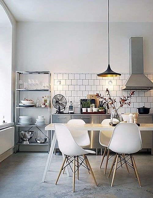 不光是地面可以用水泥,就连桌椅和梁柱都可以是水泥。当充满古旧感的水泥元素和现代气息十足的橱柜混搭在一起,呈现出一副全新的表情,生活在新旧交汇点又是怎样一种感受呢?很多人觉得水泥不够上档次,我想大概还是一个搭配的问题吧,有时用水泥地来搭北欧风或工业风,反而别有一种粗犷不羁。特别是当水泥和金属元素碰撞在一起的时候,好像真的能擦出火花。通向二层的楼梯、横在天花板上的房梁、靠在墙边的收纳架,所有的这些在水泥地面的衬托下更显冰冷光泽。