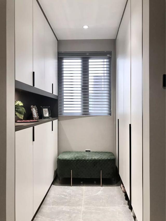 入户玄关位于入户门的侧方,是个两侧都可以做鞋柜,然后中间有窗户的格局,设计师把换鞋凳放在中间,鞋柜的底部和中间做留空处理,让这个角落变得更加实用。