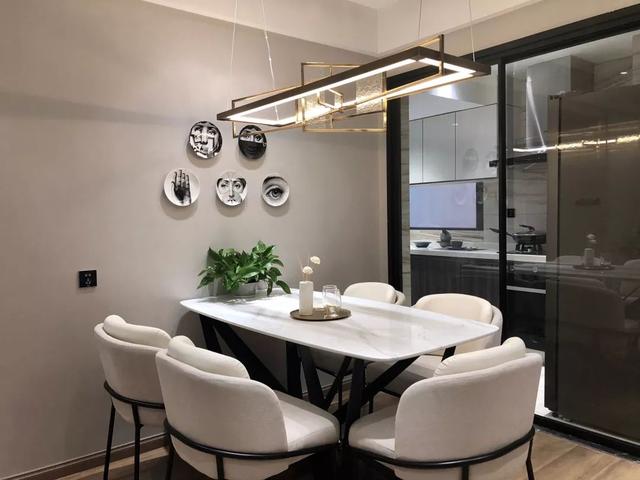 餐厅的吊灯非常有设计感,背景墙上用瓷盘作为装点,大理石的餐桌搭配舒适的布艺椅子,让餐厅给人一种时尚又舒服的感觉。