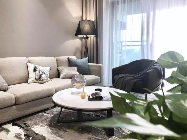 客厅的布艺沙发搭配地毯、抱枕,都给人一种舒适的感觉。在客厅角落里摆放一些绿植,也能起到提升客厅自然感的效果。