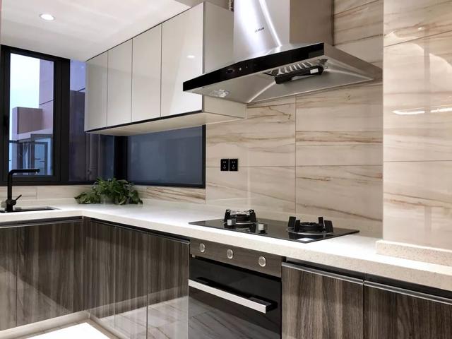 厨房的墙面是铺贴了比较常见的大理石瓷砖,褐色的墙砖搭配亮面的木纹橱柜门,让厨房看起来简洁又大方,还带有一些温馨感。
