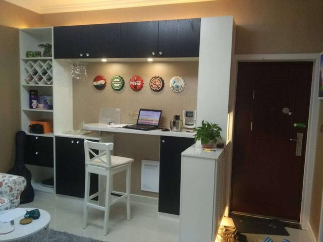 玄关,不仅仅是换鞋区域,也是办公区域。能在有限的空间内满足家庭、工作、书写是十分不容易的。工作台两边和顶部都做了柜子,提升了房子的储物功能。