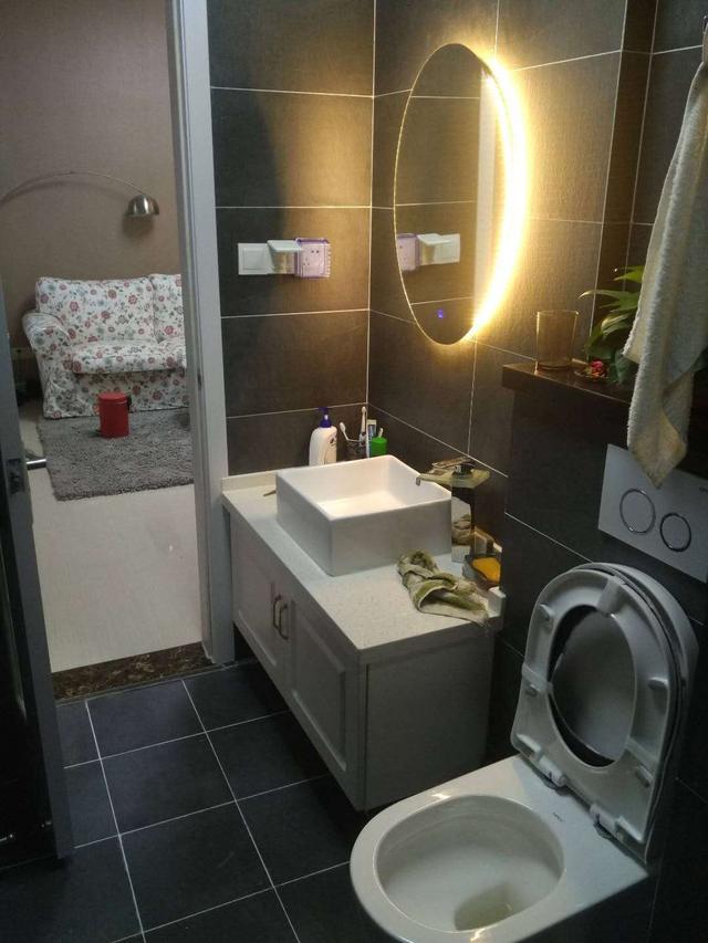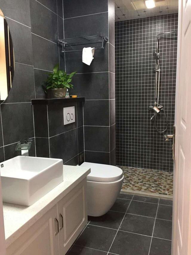 洗手间虽然狭小,却意外的让人满意。它的用色不同于厨房的卡哇伊风格,而是选择了比较深的颜色,湿区用马赛克作为区分。看上到显得非常时尚。