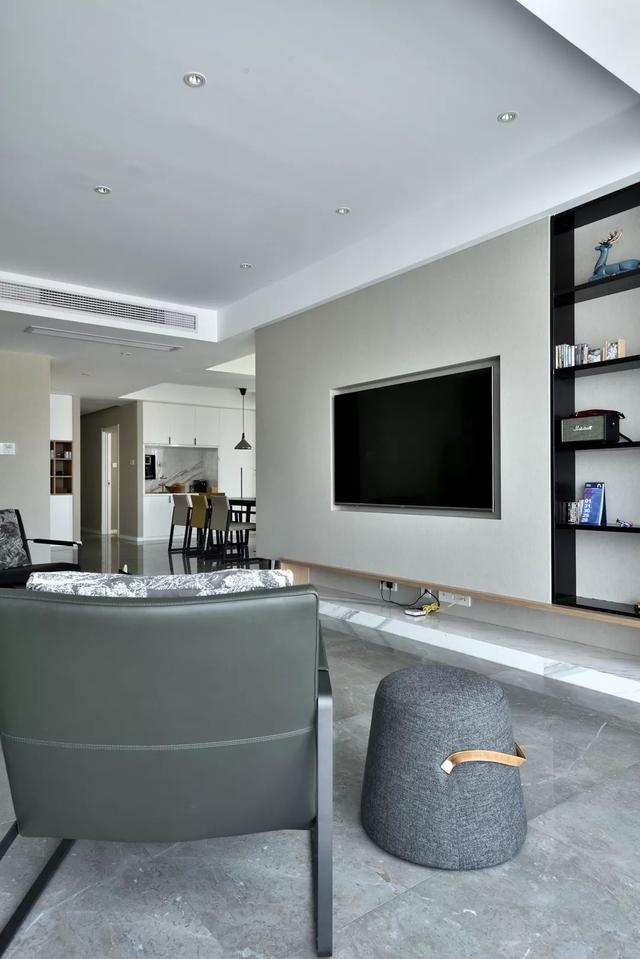 客厅的电视选择了嵌入墙内的设计,让人感觉更加简洁。底部用大理石做上一个长隔板来代替电视柜,和墙面齐平更不显突兀。