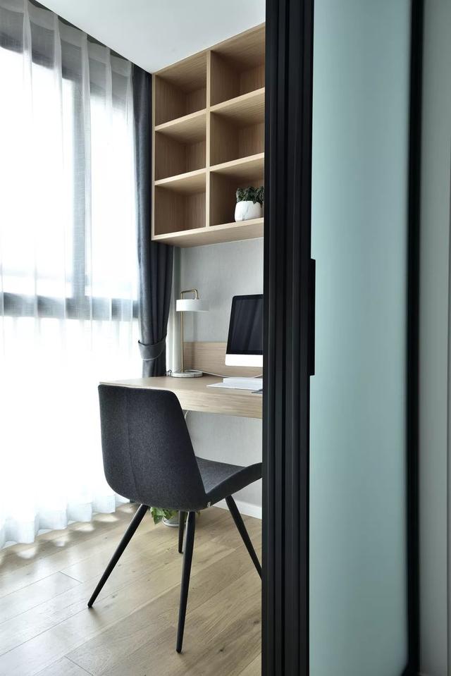 在主卧室的外面有个小阳台,被设计师改成了一个迷你的书房空间,把磨砂的玻璃推拉门给关上,也成为了一个安静的工作区。