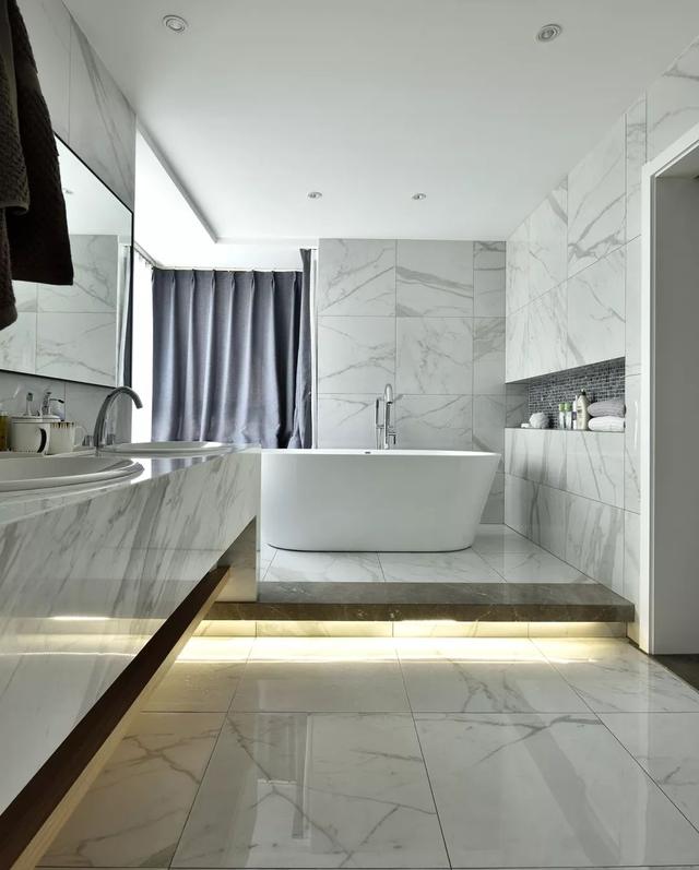 主卧的卫生间内选择了通铺大理石瓷砖的设计,把浴缸、洗手台、淋浴房和马桶都分在了不同的空间,面积足够宽敞就是这么任性。