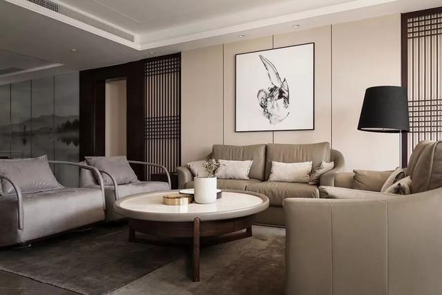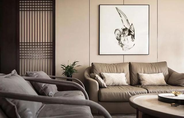 ▲沙发墙两侧做了木屏风造型,中间的泼墨挂画配合着硬包处理过的背景墙,有着独特的东方韵味;